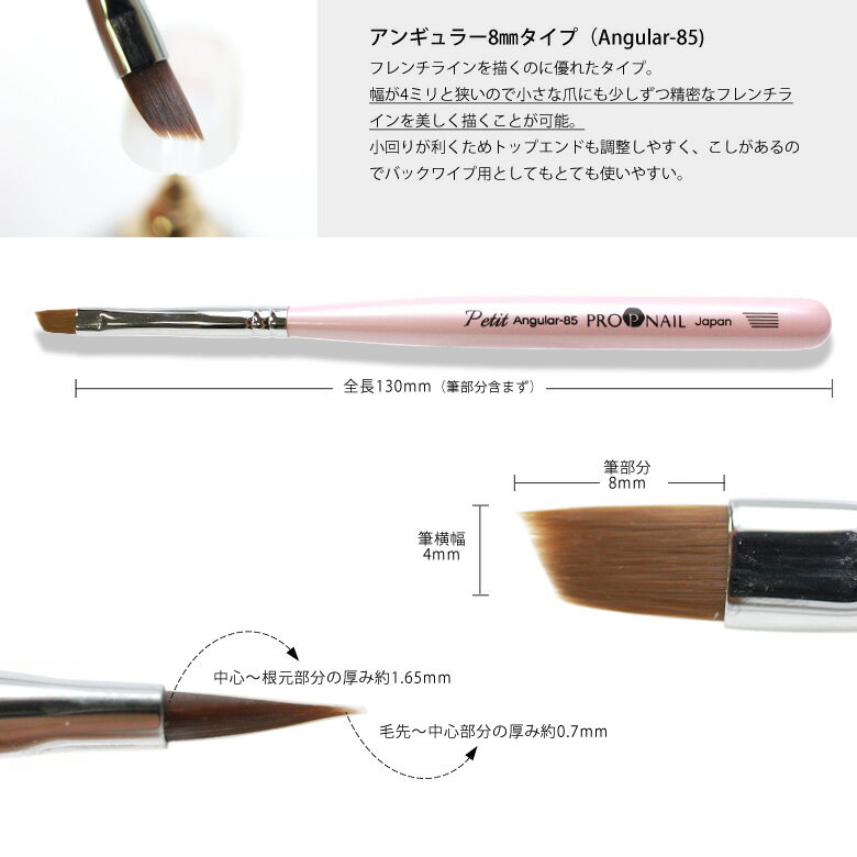 GEL BRUSH Petit キャップ付属 特徴 アンギュラー8mmタイプ(Angular-8) フレンチラインを描くのに優れたタイプ。